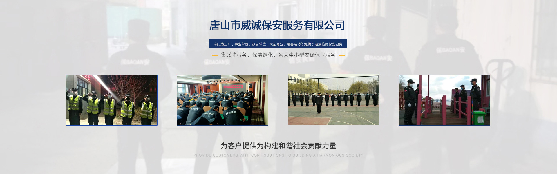 唐山市威誠保安服務(wù)有限公司自成立以來以“嚴(yán)防死守、忠于業(yè)主”為服務(wù)原則,以“客戶滿意、 合作共贏”為根本目標(biāo)。以科學(xué)的管理、多方位多層次的服務(wù),建立了首問責(zé)任制,完善了走訪、回訪 、滿意度調(diào)查、末位淘汰的預(yù)警管理,不斷提高服務(wù)質(zhì)量,提高業(yè)主滿意度,提高企業(yè)形象。秉承“誠 實(shí)守信,紀(jì)律嚴(yán)明,團(tuán)結(jié)協(xié)作,致精致誠”的服務(wù)理念,為客戶提供高品質(zhì)、多方位、專業(yè)化的保安服務(wù)。 本公司制定了嚴(yán)謹(jǐn)?shù)亩ㄏ蛘猩?、崗前培?xùn)、考核錄用、崗中培訓(xùn)、持續(xù)培訓(xùn)、末位淘汰制等一整套完善的管理體系??梢愿鶕?jù)客戶的要求實(shí)地勘察評(píng)估,以量身定做的方式提供安保防范服務(wù)。
